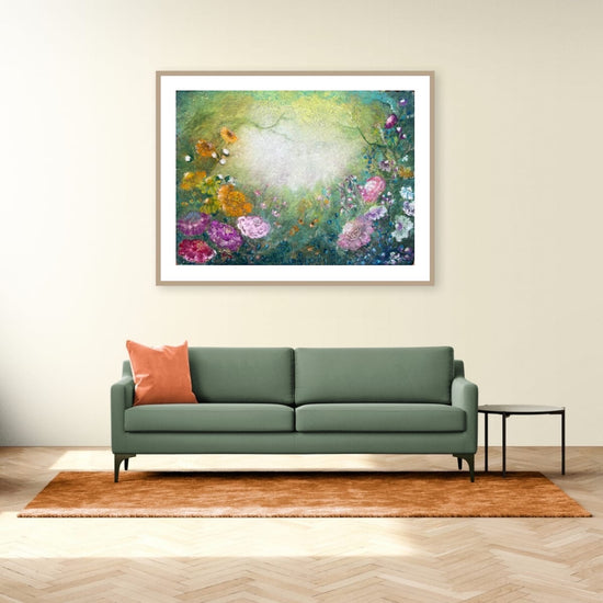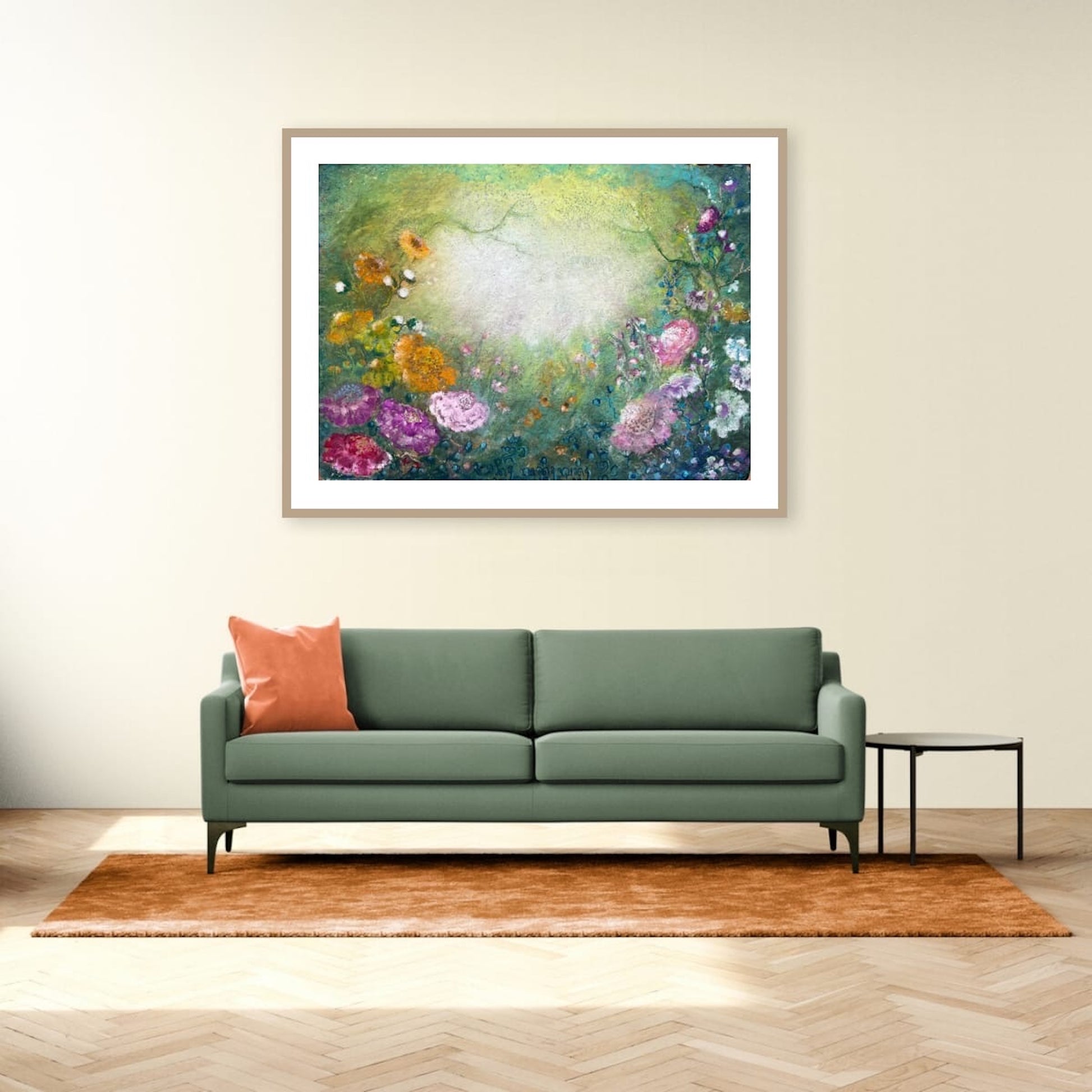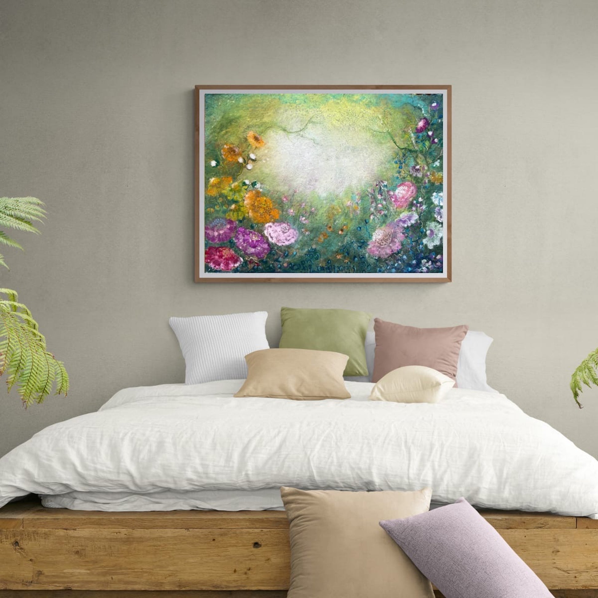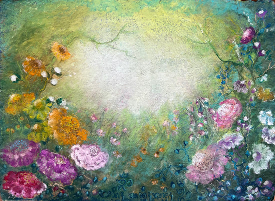 Inspired by a June morning in my garden, where roses swayed in the summer breeze, Gone with the Wind is layered with a Sanskrit peaceful mantra. This painting embodies a whisper of calm, reminding us to let go and flow with life’s rhythm. Every glance invites you to feel the breeze, the warmth of the sun, and the quiet serenity of a moment suspended in time.