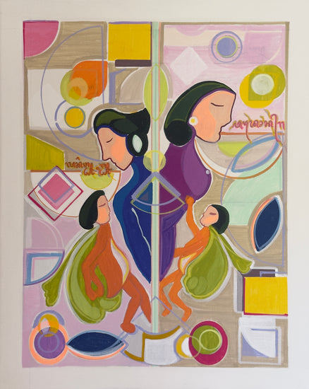 This sacred mantra anchors the painting’s emotional and spiritual depth, offering a meditation on divine guardianship, the sanctity of love, and the inner flame that binds all living beings through trust, serenity, and sacred connection. The piece radiates peace and transcendence, a visual prayer and affirmation of divine love protected by higher forces.