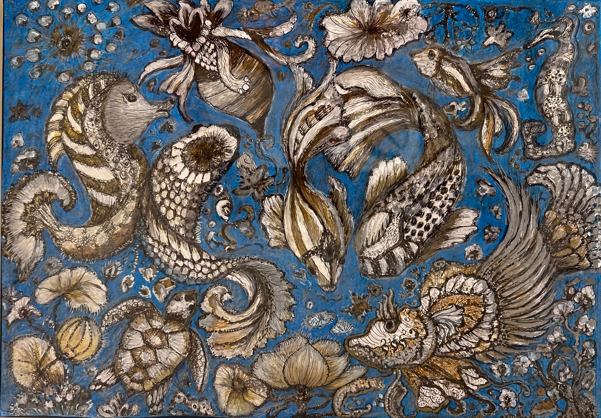 This painting is a visual journey that celebrates the beauty and variety of life beneath the waves. The steady turtle, dolphin and octopus might dance, the fishes creating choreography, the sea crocodile is a mysterious observer, and the sea horse might be gliding through the water.